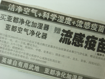 中新網(wǎng)12月14日電 今日,北京一些媒體刊出一則買亞都加濕器贈(zèng)流感疫苗的廣告,該廣告稱,從當(dāng)日起至12月31日,將在國美、大中、蘇寧的部分賣場買加濕器贈(zèng)送流感疫苗。有法律界人士認(rèn)為,按照《傳染病防治實(shí)施辦法》規(guī)定,流感疫苗這種用于防治傳染病的生物制品,應(yīng)屬各級(jí)疾控防疫體系統(tǒng)一管理,其他任何單位均無權(quán)銷售,更不能成為銷售加濕器的促銷品,所以亞都此舉已涉嫌違規(guī)。