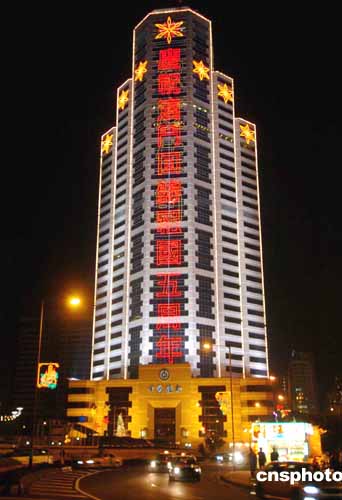 位于澳門繁華地段的中國銀行大廈,早早亮起了慶祝澳門回歸祖國五周年大型霓虹燈標語,給這座不夜城增添了濃郁的節(jié)日喜慶氣氛。作者:宋吉河