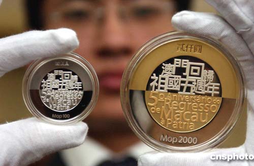 | 圖:澳門(mén)回歸五周年紀(jì)念幣亮相北京