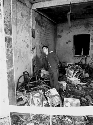 昨日上午11時左右,記者趕到現(xiàn)場看到,這棟兩層的樓房已被警方用警戒線封鎖,有民警在現(xiàn)場值班守護(hù)。大火將網(wǎng)吧內(nèi)的所有電腦設(shè)備及桌椅燒毀變形,就連距離地面約3米多高懸掛著的吊扇葉片,也被燒得變形后垂直向下,網(wǎng)吧樓上臨街的二樓全部被熏成黑色。
