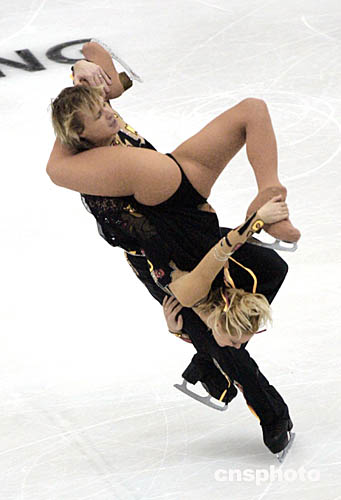二零零四年十二月十八日晚在北京首都體育館舉行的世界花樣滑冰大獎賽總決賽冰舞比賽中,各國選手爭相斗艷,上演了一曲曲美侖美奐的冰上盛宴。圖為加拿大選手杜布雷爾/倫佐在比賽中。中新社記者:武仲林
