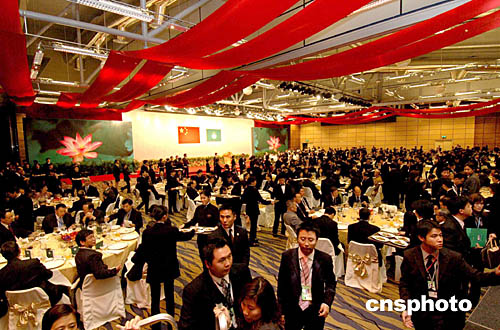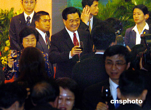 晚七時(shí),在澳門(mén)警察局銀樂(lè)隊(duì)奏響的迎賓曲和二百多名各界嘉賓的熱烈掌聲中,胡錦濤主席和夫人劉永清在澳門(mén)特區(qū)行政長(zhǎng)官何厚鏵及夫人劉渭楨的陪同下步入宴會(huì)廳。