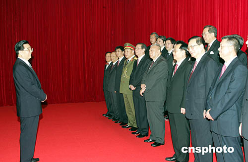 十二月二十日上午,胡錦濤在澳門文化中心會(huì)見香港特區(qū)政府官員,并在合影后發(fā)表講話。作者:宗金柱