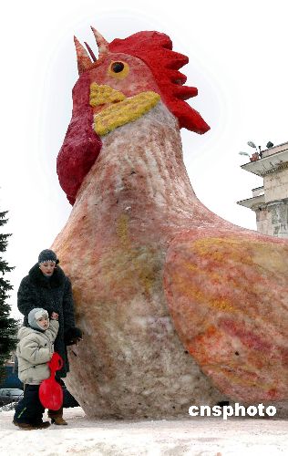 12月18日,在俄羅斯的里賓斯克,一只70噸重的雪雕大公雞在一公園亮相,迎接新年到來。Ic/cnsphoto