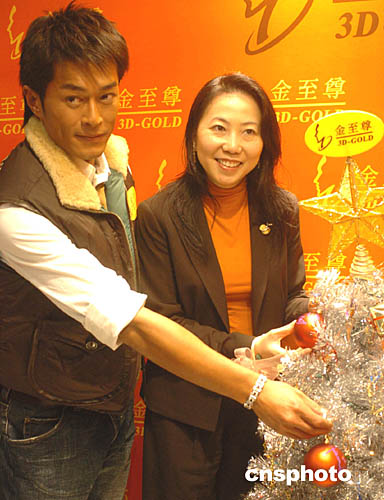 香港影視紅星古天樂(左)23日在香港金至尊主席伍綺媚的陪同下﹐出席銅鑼灣又一新店的開業(yè)儀式﹐并許下圣誕愿望掛于樹上﹐求得平安。
