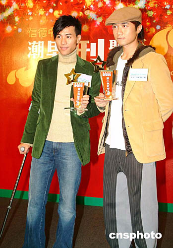 踏入年終,香港樂壇頒獎禮一觸即發(fā),眾歌星紛紛外出宣傳拉票。12月23日,信德中心邀請被喻為樂壇『新四天天王』的其中兩位大熱型男古巨基、梁漢文出席慈善活動。大會特別頒發(fā)『2004年度樂壇愛心型男金獎』的獎座感謝古巨基[右]、梁漢文的鼎力支持。作者:洪少葵