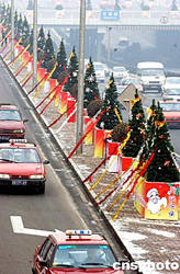 十二月二十四日,北京東三環(huán)農(nóng)展橋兩邊立起了一百多棵圣誕樹(shù),并在路旁裝點(diǎn)了彩色的塑料花,為節(jié)日增添了喜慶的氣氛。作者:韓藝冰