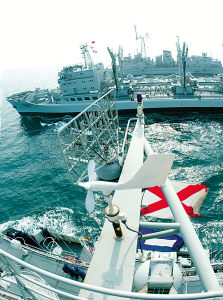 此次演練中,補給演練尤其引人注目。當中方指揮員張盤洪少將下達補給命令后,“哈爾濱”號、“拉圖什特威爾”號和“比羅司令”號3條戰(zhàn)艦呈倒品字形圍繞“洪澤湖”號航行,先后進行了3艦同時補給和單艦補給模擬演練。據(jù)了解,補給演練內容是延長戰(zhàn)斗力的訓練課目,是檢驗海軍遠海聯(lián)合作戰(zhàn)能力的訓練。