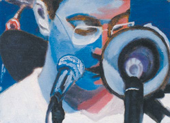 竇唯還特別喜歡用畫描繪自己樂隊演出時的景象,在昨日曝光的作品中就有兩幅。從畫面上看,一組搖滾樂隊正在舞臺上盡情揮灑激情,而臺下的觀眾也投入欣賞。另外一幅自畫像更是惹眼,藍(lán)色是畫的基調(diào),畫中的竇唯掩在兩只話筒后面,低頭正沉醉地低唱著?偟目磥,竇唯的小畫未必惹眼但很精妙。不賣不展