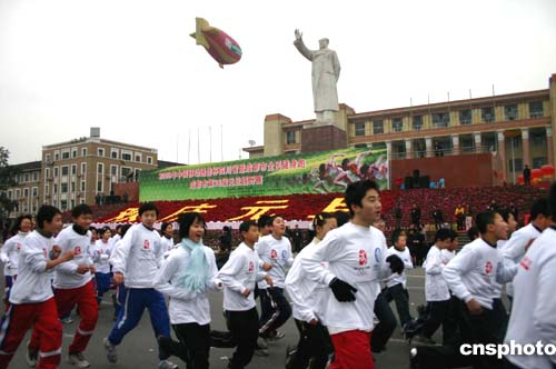 今天上午九時(shí),在成都市中心的天府廣場(chǎng)上,以“祝福健康、跑向二00八”為主題的四川省暨成都市全民健身跑拉開了帷幕。在綿陽(yáng)、樂山、雅安等其他七個(gè)城市,迎新年全民健身跑同時(shí)舉行。
