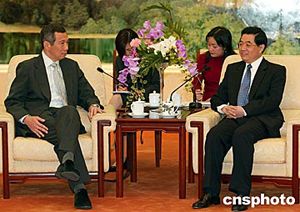國家主席胡錦濤五月十四日在北京會(huì)見新加坡副總理李顯龍。中新社記者:滿會(huì)喬