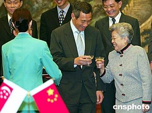 五月十四日,中國國務(wù)院副總理吳儀在北京會(huì)見新加坡副總理李顯龍。中新社記者:滿會(huì)喬