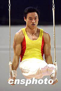 5月14日晚,中國(guó)國(guó)家體操隊(duì)隊(duì)員楊威在江蘇蘇州舉行的全國(guó)體操錦標(biāo)賽暨雅典奧運(yùn)選拔賽資格賽吊環(huán)比賽中大顯身手,并以總分57.825分的成績(jī)獲得全能冠軍。中新社記者:盛佳鵬