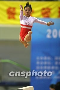5月15日,在蘇州進(jìn)行的全國(guó)體操錦標(biāo)賽暨雅典奧運(yùn)會(huì)資格選拔賽中,中國(guó)國(guó)家女隊(duì)隊(duì)員張楠、康欣以37分并列個(gè)人全能第三。參加比賽的全部15名國(guó)家女隊(duì)隊(duì)員,總體表現(xiàn)尚可。圖為張楠在自由體操比賽中。中新社記者:盛佳鵬