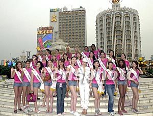 參加由澳門博彩股份有限公司承辦的“世界名模在澳門”活動(dòng)的第十六屆世界模特小姐大賽三十國冠軍佳麗十七日首次匯聚濠江,在澳門著名的葡京酒店前廣場合影,展示風(fēng)采。中新社記者:李剛