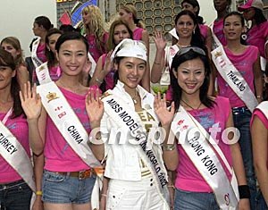 參加由澳門博彩股份有限公司承辦的“世界名模在澳門”活動(dòng)的第十六屆世界模特小姐大賽三十國冠軍佳麗十七日首次匯聚濠江,在澳門著名的葡京酒店前廣場展示風(fēng)采,圖為中國區(qū)冠軍馬力(左)、上屆世界冠軍延魏(中)和香港冠軍張穎向澳門致意。中新社記者:李剛