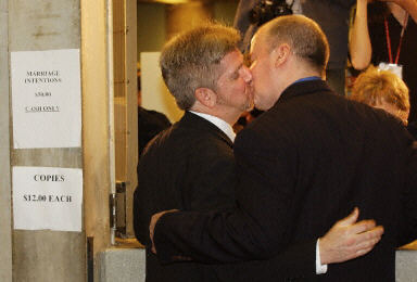 5月17日這一天,美國同性伴侶在美利堅(jiān)的土地上將第一次獲得合法婚姻的權(quán)利。馬薩諸塞州最高法院2003年11月裁定,禁止同性戀者結(jié)婚違反反歧視法,因此將從2004年5月17日起允許同性戀者在該州登記結(jié)婚。