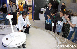五月中旬,正在北京舉行的“二零零四全國(guó)科技活動(dòng)周暨北京科技周”上一款月球機(jī)器人首次亮相。這款機(jī)器人名叫“喀嗎哆”,能跨越障礙并進(jìn)行三百六十度觀(guān)察和攝像記錄。作者:徐曦弋