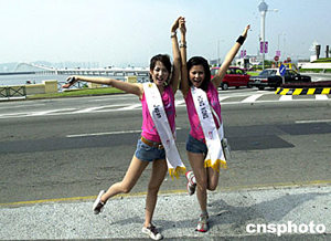 由澳門博彩股份有限公司承辦的“世界名模在澳門”的世界模特小姐們,十八日在葡京酒店前,擺姿勢留影。中新社記者:李剛