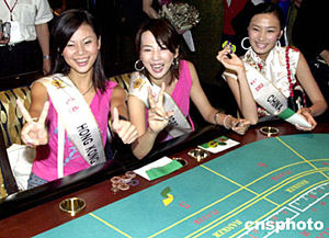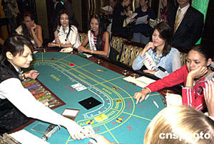 由澳門博彩股份有限公司承辦的“世界名模在澳門”的世界模特小姐們,十八日來到葡京酒店水晶宮娛樂場,興高采烈地博殺起來。中新社記者:李剛