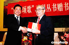 五月十九日,山東省臨沂市在北京人民大會(huì)堂舉行《沂蒙頌歌》大型叢書贈(zèng)書座談會(huì)。中共臨沂市委書記李群向曾在沂蒙地區(qū)指揮作戰(zhàn)的原中央軍委副主席、國防部長遲浩田(右)贈(zèng)書。中新社記者:王麗南