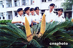 被廣東湛江評為“花園式單位”的軍港保障部隊營區(qū)內(nèi)五月初出現(xiàn)了一道新風景:十余棵鐵樹紛紛吐出了金黃色的花蕊,其中有兩棵還開出了并蒂花。這一罕見奇葩,吸引了不少官兵前來觀賞。作者:梁利靈