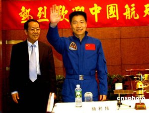 包括楊利偉在內的中國載人航天工程代表團今天上午向聯(lián)合國秘書長安南移交了“神舟”五號飛船所攜載的聯(lián)合國旗幟后,下午在中國駐紐約總領館與當?shù)貎S學界見面。身穿蘭色制服的楊利偉保持著一貫的謙虛,在發(fā)言時表示:他的十四名航天員戰(zhàn)友都具備完成首飛任務的能力,他只是一名普通的航天員,是中國人民用智慧的雙手把自己送上了太空。