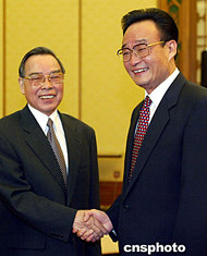 中新社北京五月二十一日電 (記者 朱大強(qiáng))中國全國人大常委會委員長吳邦國和全國政協(xié)主席賈慶林今天在此間分別會見了越南總理潘文凱。他們指出,雙方要共同珍惜和精心維護(hù)友好關(guān)系,妥善處理存在的問題。