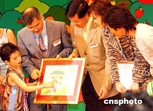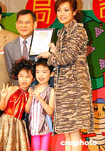 香港保良局五月二十二日舉行誼親日招待助養(yǎng)人士,圖為小朋友向“兒童助養(yǎng)大使”香港影視紅星鄭伊健、歌星容祖兒贈送繪畫作品。作者:錢興強