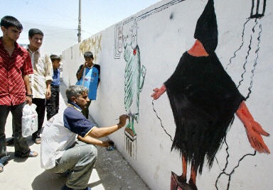 5月23日,一名伊拉克藝術家在巴格達附近的薩德爾城將美軍虐待伊拉克俘虜?shù)恼掌嫷綁Ρ谏,并在旁邊畫上一個美國“自由女神像”。