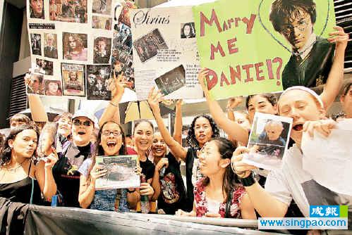 中新網(wǎng)5月25日電 據(jù)香港成報報道,魔幻電影《哈利波特》第三集《哈利波特與阿茲卡班的囚徒》前日在紐約作全球首映。演哈利的英國影星丹尼爾·拉德克里夫除獲不少名人捧場外,更獲數(shù)千位影迷圍睹,當(dāng)中不少更舉頭著紙牌向丹尼爾當(dāng)場求婚。
