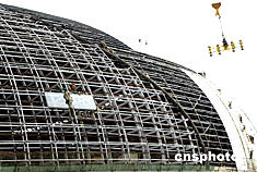 國家大劇院橢球屋面的中央,是由兩條不規(guī)則漸開曲線圍成的弧形玻璃幕墻和穹頂,雖然玻璃還沒有安裝上去,但是整個構(gòu)造還是如同一簾拉開的幕布。據(jù)國家大劇院金屬屋面及幕墻工程的總指揮羅憶介紹,當(dāng)天要安裝的就是裝點(diǎn)這塊“幕布”的玻璃,這些玻璃是國家大劇院的最外層的幕墻玻璃,也是整體景觀效果最明顯的部分。