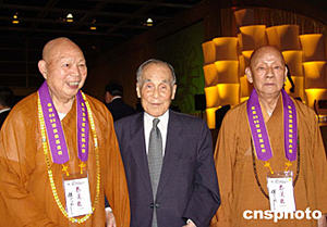 香港佛教文化產(chǎn)業(yè)董事長莊世平(中)與全國佛協(xié)會(huì)長一誠法師(左)、副會(huì)長根通法師(右)在慈善拍賣會(huì)上。中新社圖