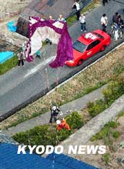 中新網(wǎng)5月27日電 日本當?shù)貢r間26日下午1時許,由一名23歲女性駕駛的滑翔傘在日本廣島縣尾道市吉和町被距離地面約30米的高壓電線所絆,并被懸在半空中。