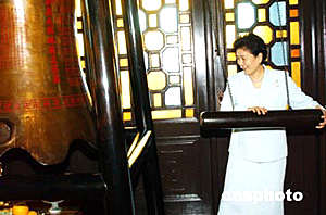 正在香港訪問的全國政協(xié)副主席、中共中央統(tǒng)戰(zhàn)部部長劉延?xùn)|,五月二十七日來到香港觀宗寺參觀,在大雄寶殿敲鐘祈福。 作者:錢興強