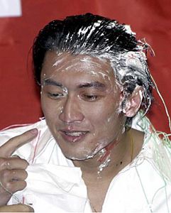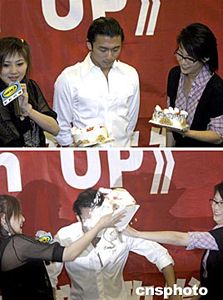 五月二十九日晚,在美卡音像為謝霆鋒新專輯《LISTEN UP》熱賣舉行的慶功會上,謝霆鋒毫無防備被工作人員準備的雙份蛋糕“擊中”全臉,頓失俊朗形象。中新社記者:高遠