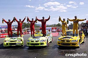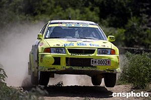 2004年全國(guó)汽車?yán)﹀\標(biāo)賽“海淀駕校杯”北京拉力賽經(jīng)過(guò)2天激烈的較量5月30日在北京落下帷幕,由于鳳凰嶺惡劣的路況,參賽的68部賽車今天共有49部賽車參加比賽。N組冠軍被咳速停拉力車隊(duì)11號(hào)車(中)的英國(guó)外援大衛(wèi)·辛吉斯/丹尼爾·巴里特獲得,亞軍是佳通輪胎車隊(duì)(右)的劉曹東/周麗,咳速停拉力車隊(duì)的劉斌/黃煜獲得第三名。中新社記者:盛佳鵬