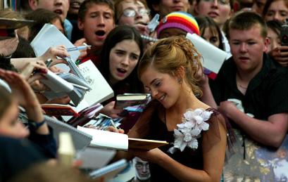 扮演哈利波特的丹尼爾在進(jìn)入影院之前為影迷們在海報(bào)和照片上簽名!罢媸菈延^呀,我好激動,比紐約首映式的規(guī)模大多了。”