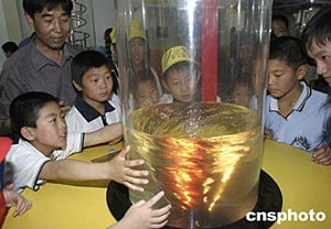六月一日,幾名打工子弟在宋慶齡科技館觀看漩渦演示器。宋慶齡基金會專門撥款四十余萬元為科技館增添了一批科普活動器材,先后邀請一百多名打工子弟免費來此歡度“六一”。中新社記者:史利