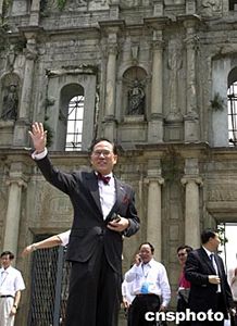 香港政務(wù)司司長(zhǎng)曾蔭權(quán)在參觀大三巴時(shí)向圍觀的澳門(mén)市民揮手致意。作者:梁永強(qiáng)