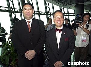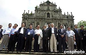 代表團(tuán)成員香港政務(wù)司司長(zhǎng)曾蔭權(quán)與澳門(mén)社會(huì)文化司司長(zhǎng)崔世安在參觀澳門(mén)旅游塔時(shí)合影。作者:梁永強(qiáng)  當(dāng)天上午代表團(tuán)參觀著名的大炮臺(tái)。作者:梁永強(qiáng)