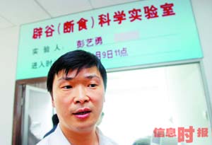 據(jù)彭先生介紹,1996年他曾在工廠里自行絕食過53天。開頭的幾天內(nèi),感到很難受,到了第四天以后,饑餓感消失,而且感覺很舒服,思維、行動(dòng)變得敏捷靈活了!爸灰莆兆銐虻尼t(yī)學(xué)理論,絕食60天絕對沒有問題!迸硐壬@得非常自信地說。