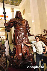 六月在北京民族文化宮舉辦的首屆中國民間工藝品博覽會(huì)上,一尊大型紫花梨木雕像“九龍關(guān)公”令人嘆為觀止。該雕像高三點(diǎn)二米,加上佩刀總高三點(diǎn)六六米,重三噸,是用四點(diǎn)二米高的梨木制成。該雕像作品由沈陽根雕藝術(shù)家劉家鵬、趙維強(qiáng)(圖)和劉自豪歷經(jīng)三年制作而成。中新社記者:鄒憲