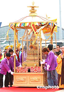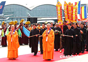 中國佛教協(xié)會副會長圣輝法師五日上午在香港國際機場登上恭送佛指舍利專機,護送佛指舍利回法門寺。中新社記者:趙振清