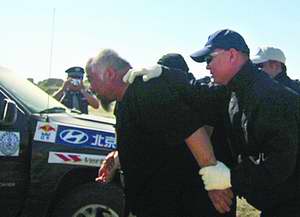 路虎車(chē)內(nèi)跳下的第一人只跑出兩米遠(yuǎn),就被擊中,躺倒在地。剩下的兩人沒(méi)有抵抗。一個(gè)穿著黑色對(duì)襟中式衣褲的大胡子男子下車(chē)就舉手投降,面部表情極為痛苦,兩眼緊閉。司機(jī)一直在發(fā)動(dòng)車(chē)輛試圖脫險(xiǎn),終被兩名警察押下。