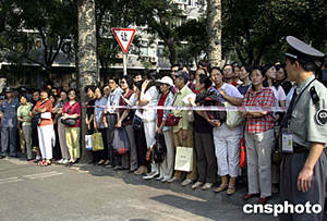 六月七日,二○○四年高考首日,北京第四中學(xué)考場外的考生家長們焦急地等待著應(yīng)考的孩子。中新社記者:張勤