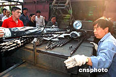 六月八日下午,發(fā)生坍塌事故的北京大安山煤礦的工人正準(zhǔn)備將大批鉆桿運(yùn)往井下。六月六日,位于北京郊區(qū)的大安山煤礦發(fā)生礦井塌冒事故,井下十名礦工被困。為了直接進(jìn)入坍塌地點(diǎn)營(yíng)救被困礦工,救援人員目前正在全力打通巷道,如果進(jìn)展順利,九日上午可望打通。六月八日,救援人員已成功向坍塌地點(diǎn)注入氧氣。中新社記者:張煒