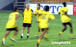 六月八日,馬來西亞足球隊在天津泰達足球場進行適應(yīng)場地訓(xùn)練。二零零六年世界杯足球賽亞洲區(qū)預(yù)賽中國隊對馬來西亞隊的比賽將于六月九日晚在這里舉行。圖為馬來西亞主教練哈里斯正對隊員進行現(xiàn)場指導(dǎo)。中新社記者:毛建軍