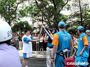 六月九日上午,二○○四年雅典奧運(yùn)火炬北京接力活動(dòng)開(kāi)始。圖為中國(guó)射擊老將王義夫在接傳火炬。作者:宋海濤