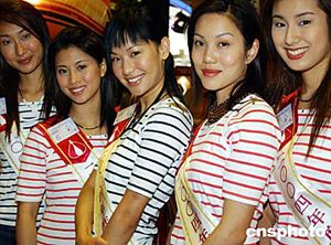 十八位2004年度香港小姐候選佳麗,六月十三日來(lái)到會(huì)展中心舉行的香港國(guó)際旅游展參加活動(dòng)。作者:錢(qián)興強(qiáng)